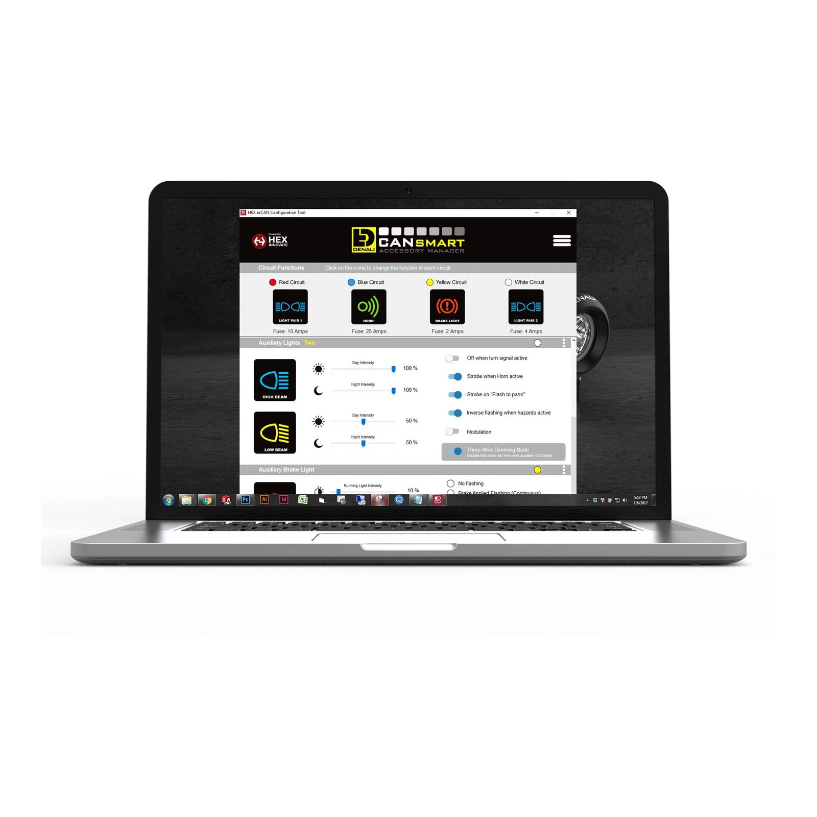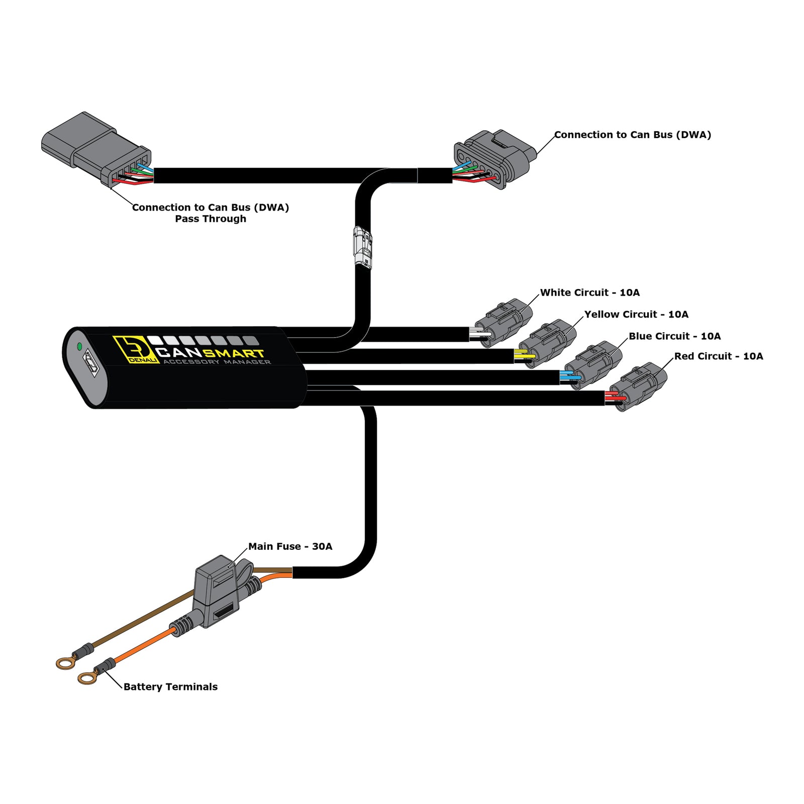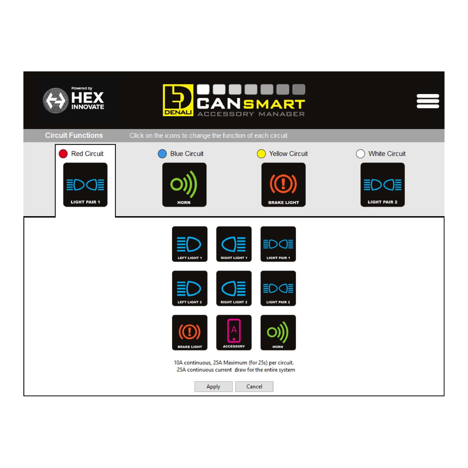 The CANsmart's four circuits are preprogrammed to connect and independently control two sets of DENALI 2.0 lights, a SoundBomb horn, and our B6 auxiliary brake light.