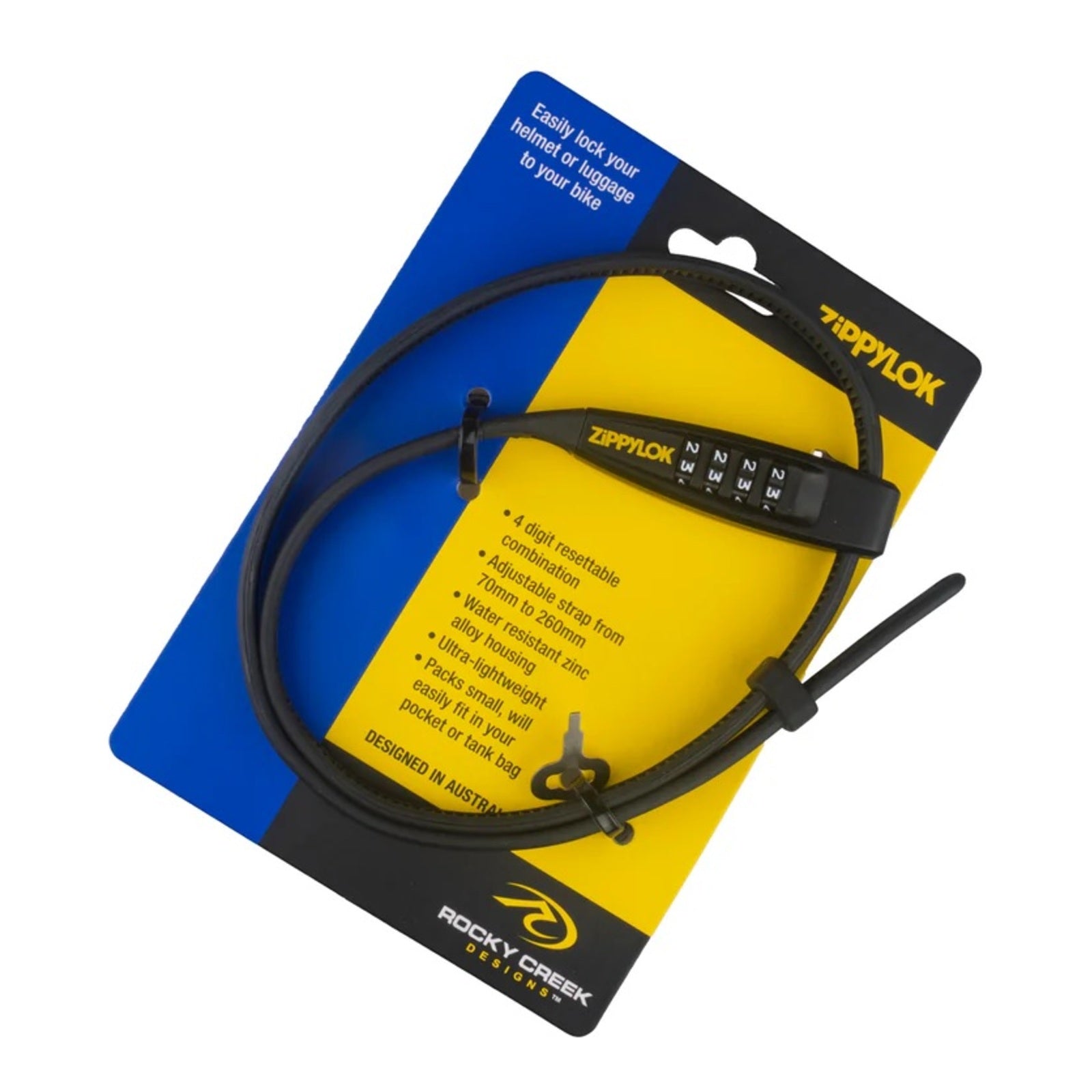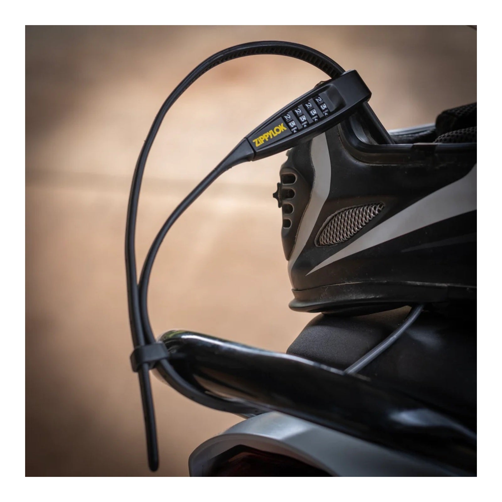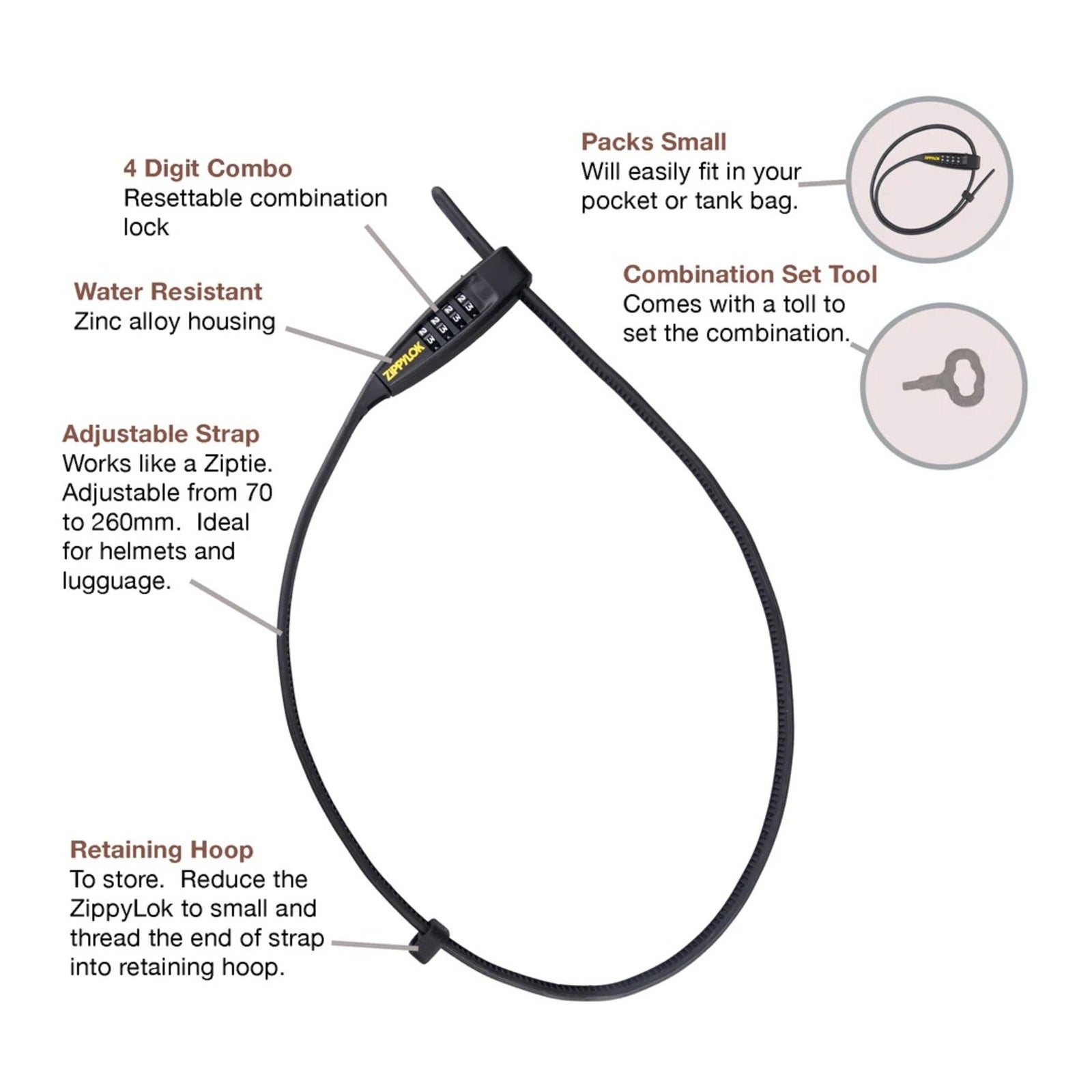 Secure your essentials - helmet, luggage, and jacket - to your bike with the ZippyLok! This lockable "zip tie" is a fully adjustable ratcheting system with a resettable, 4-digit combination lock. Its maximum adjustable circumference is 260mm, and it weighs just 113g, making it an ideal travel companion, easily fitting into any pocket or tank bag. The strap is made from a steel core, wrapped in anti-scratch plastic to protect your bike. The weather-resistant body and locking mechanism are made from zinc alloy for absolute security.