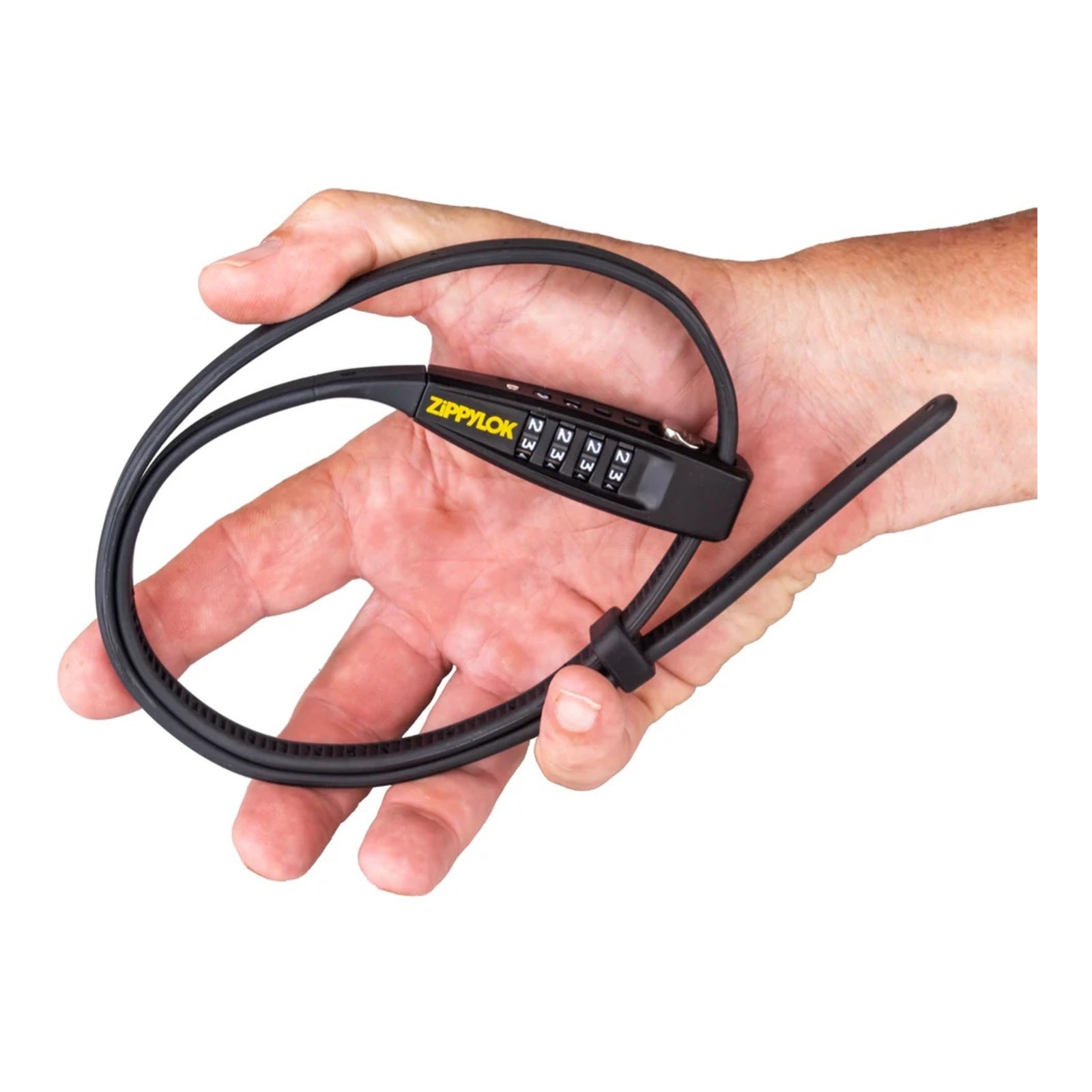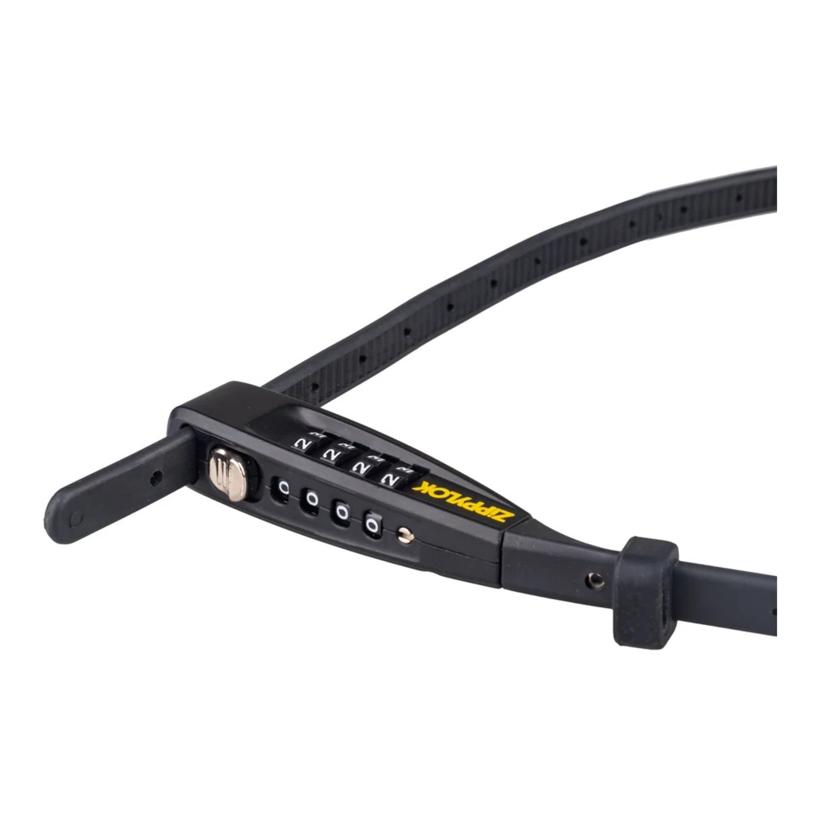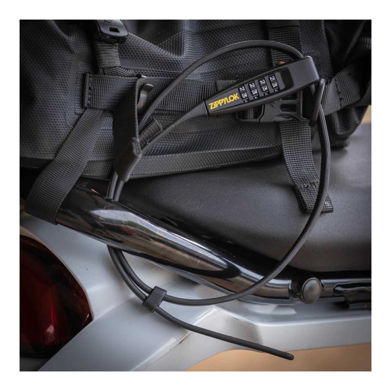 Secure your essentials - helmet, luggage, and jacket - to your bike with the ZippyLok! This lockable "zip tie" is a fully adjustable ratcheting system with a resettable, 4-digit combination lock. Its maximum adjustable circumference is 260mm, and it weighs just 113g, making it an ideal travel companion, easily fitting into any pocket or tank bag. The strap is made from a steel core, wrapped in anti-scratch plastic to protect your bike. The weather-resistant body and locking mechanism are made from zinc alloy for absolute security.