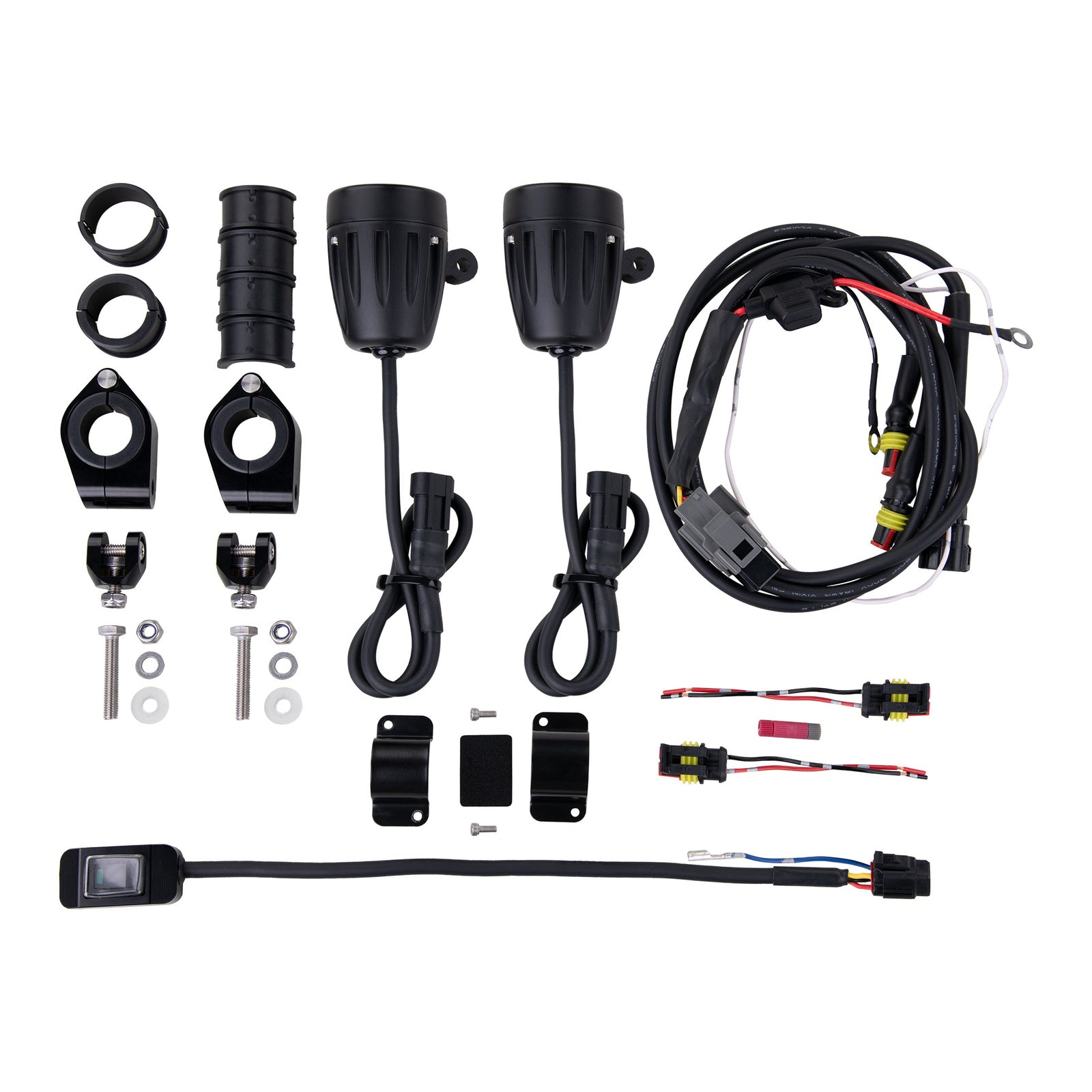 Oxford's Auxiliary Lights are a great aesthetic for adventure-style bikes. The kit comes with adjustable mounting brackets (suitable for bars from 22-28mm in diameter), a waterproof handlebar switch and a trigger wire for splicing into the motorcycle's flasher switch if this functionality is required.