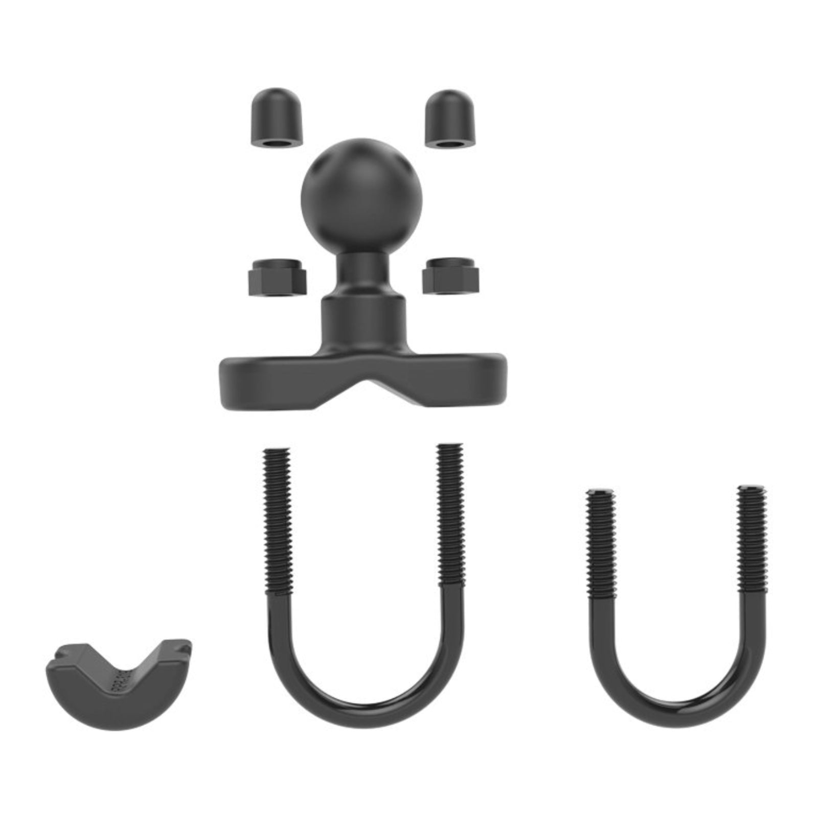 Ideal for motorcycle handlebars, the RAM-B-231ZU consists of a 1" B size rubber ball attached to a zinc-coated metal U-bolt base. Designed to sit at right angles to the mounting rail, the U-bolt base accommodates rails from 0.5" to 1.25" in diameter. Included are black cover caps to be placed over the exposed ends of the U-bolt as well as a composite adapter that can narrow the rail to a minimum width of 0.5".